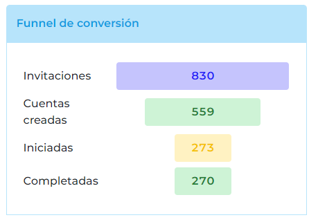 Allí verás el total de invitaciones a realizar la evaluación, filtradas por cuentas creadas, iniciadas y test completados.