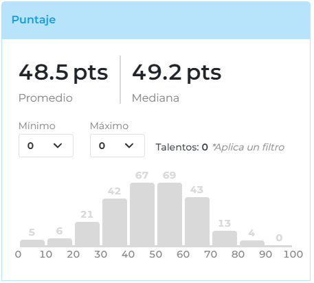 Obtendrás un detalle del puntaje de las evaluaciones realizadas dentro de Alkymetrics, donde podrás filtrar seleccionando el mínimo y máximo de requerimiento para avanzar a la siguiente etapa del proceso de selección.